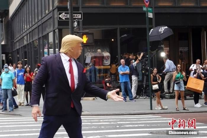 資料圖:當?shù)貢r間8月10日,一名戴著面具的示威者在美國紐約特朗普大廈外模仿美國前總統(tǒng)特朗普。近兩日,特朗普大廈前示威者、記者、圍觀民眾等人流聚集。 中新社記者 廖攀 攝